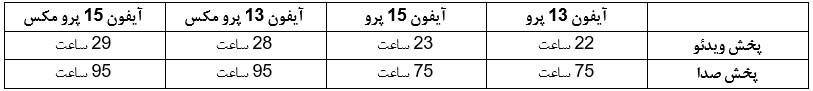 در مقایسه آیفون 13 پرو و آیفون 15 پرو از نظر عمر باتری، شاهد یک ساعت دوام باتری بیشتر برای پخش ویدئو در 15 پرو هستیم و برای پخش صدا نیز امتیاز یکسانی دارند.