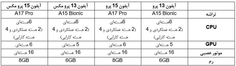 در جدول زیر خلاصهای از مشخصات تراشه iPhone 13 Pro در مقایسه با iPhone 15 Pro را آوردهایم: