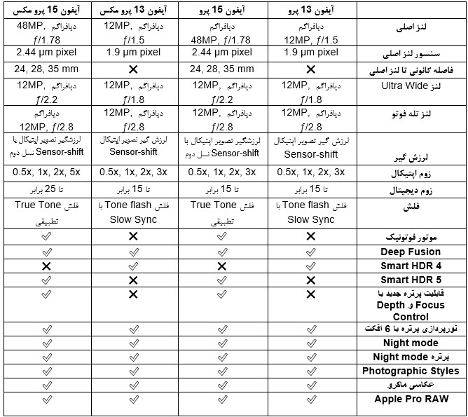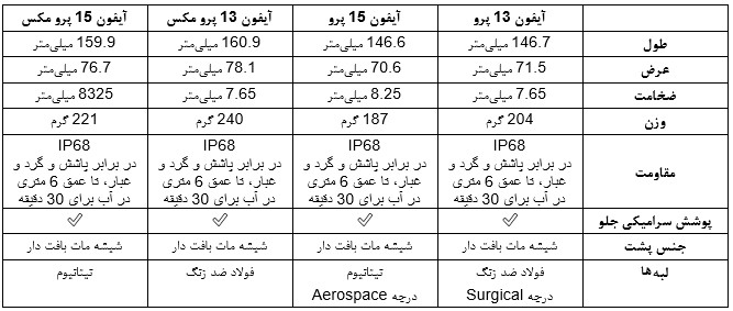 برای راحتی کار شما در جدول زیر به مقایسه کلی آیفون 15 پرو و آیفون 13 پرو از نظر اندازه، وزن و مواد تشکیل دهنده پرداختهایم: