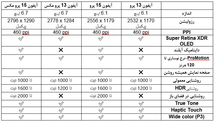 تمایز اصلی صفحه نمایش آیفون 15 پرو و پرو مکس در قابلیت صفحه نمایش همیشه روشن، داینامیک آیلند، ProMotion 12 هرتز و افزایش روشنایی در فضای باز تا 2000 نیت است. علاوه بر این، حاشیههای آیفون 15 پرو باریکتر از آیفون 13 پرو است که باعث افزایش بسیار جزئی در تعداد پیکسلها میشود. در جدول زیر میتوانید نگاهی کامل به مشخصات و ویژگیهای نمایشگر این دو گوشی رده بالای اپل بیندازید: