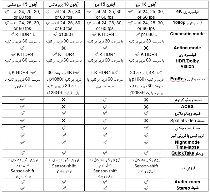 در ضبط ویدئو و فیلمبرداری نیز شاهد بهبودهایی نسبت به 13 پرو هستیم. پشتیبانی از USB-C 3 در مدلهای 15 پرو به معنای توانایی فیلمبرداری مستقیم از ProRes به درایوهای خارجی در 4k60 است.