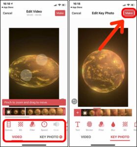 2. شما می توانید زمان فیلم را تنظیم کنید، پس زمینه فیلم را عوض کنید، تصویر را خط بندازید، روی آن فیلتر بگذارید، سرعت یا ابعاد آن را تغییر دهید و با آن را کراپ کنید. بعد از اعمال همه تغییرات دکمه Make (بالا سمت راست صفحه) را لمس کنید.