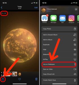 4. سپس برنامه Photos را باز کنید و لایو فوتو ای که ذخیره شد را باز کنید. باید آیکون live مانند تصویر زیر در گوشه بالا سمت چپ صفحه روی آن نمایش داده شود. گزینه Share button (در پایین سمت چپ صفحه) را لمس کنید و سپس گزینه Use as Wallpaper را انتخاب کنید.