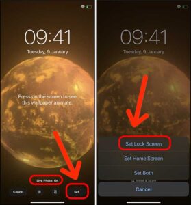 5. به یاد داشته باشید که حتما تنظیمات لایو فوتو فعال باشد. سپس گزینه Set و بعد گزینه Set Lock Screen را انتخاب کنید.