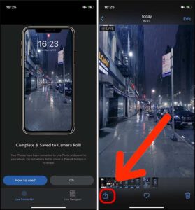 4. برای تست این برنامه ما یک فایل ویدئویی 45ثانیه ای را به والپیپر متحرک تبدیل کردیم. اپلیکیشن VideoToLive مدت زمان فایل را کم نکرد و همان 45 ثانیه را به ما تحویل داد. شما می توانید تصویر متحرک جدید را در برنامه Photos ببینید. لایو فوتو را لمس کنید و گزینه Share (پایین، سمت چپ صفحه) را انتخاب کنید.