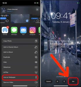 5. سپس گزینه Use as Wallpaper را لمس کنید. به یاد داشته باشید که تنظیمات لایو فوتو را فعال کرده باشید و بعد دکمه Set (پایین سمت راست صفحه) را لمس کنید.