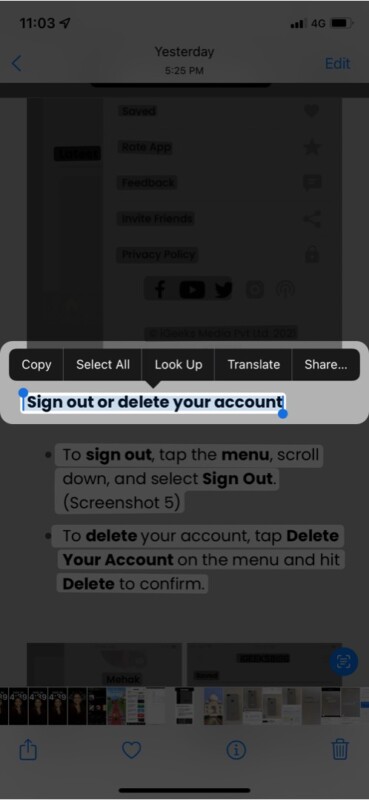 چندین بار که متن درست تشخیص داده شد، میتوانستیم متن را انتخاب کرده و اقداماتی مانند کپی، انتخاب همه، جستجو و ترجمه و اشتراکگذاری را انجام دهیم.