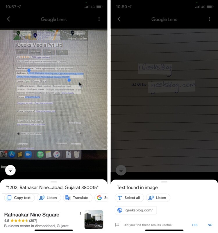 در مقایسه با آن، Google Lens هر نوع متنی حتی دستخط را سریعاً تشخیص میدهد. همچنین پس از تشخیص شماره تلفن، آدرس وب، آدرس خیابان و غیره، اقدامات لازم در آن زمینه مربوطه را ارائه داد. در این مقایسه برنده اصلی Google Lens است.