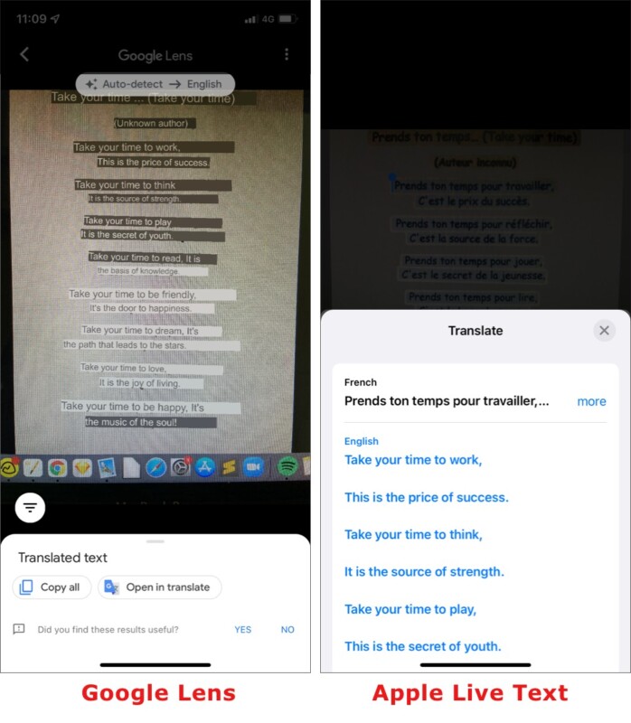 گوگل لنز ترجمه را درست بر روی متن در تصویر قرار میدهد. در حالی که لایو تکست ترجمه را زیر متن ارائه میدهد.