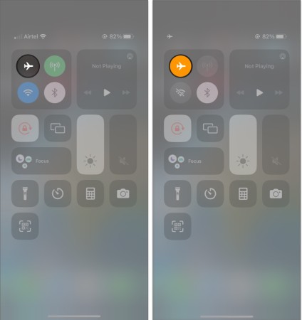 به Control Center بروید و بر روی آیکن Airplane Mode ضربه بزنید تا دستگاه در حالت پرواز قرار گیرد. زمانی که این ویژگی فعال است آیکن به رنگ زرد در میآید.
