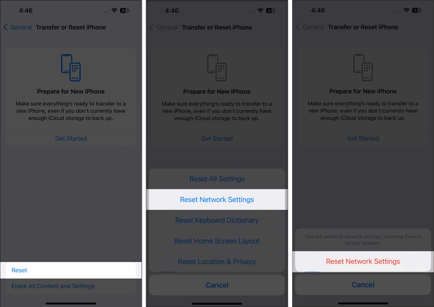 - سپس بر روی Reset و Reset Network Settings ضربه بزنید.
