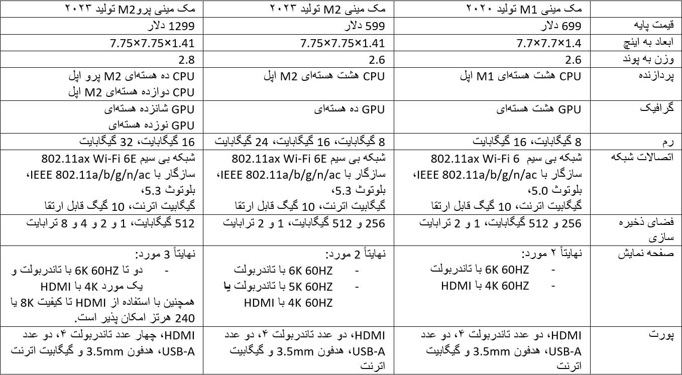 در اولین قدم، جدولی از مشخصات کامل سه مدل مک مینی را مشاهده میکنید و در نگاهی گذرا با شباهتها و تفاوتهای آنها آشنا میشوید.