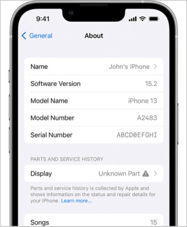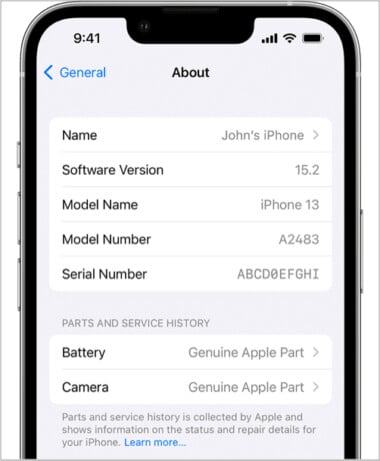 برای این کار ابتدا باید به مسیر Settings → General → About بروید. در این قسمت می توانید گزینهی تاریخچهی تعمیر آیفون iPhone repair history را مشاهده کنید. اگر نسخهی سیستم عاملتان iOS 15.1 باشد، تنها می توانید اصل یا غیراصل بودن قطعات را مشاهده کنید.