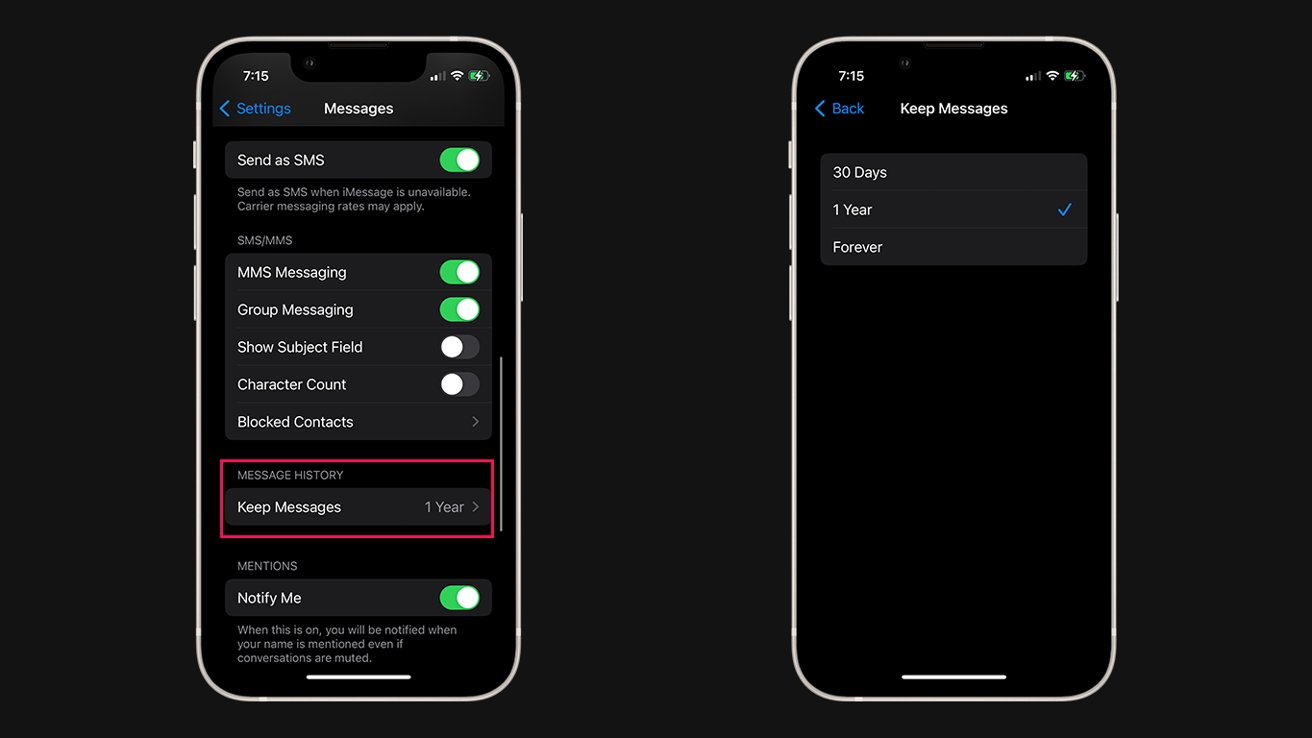 اولین قدم این است که مدت زمان ذخیره پیام‌های خود را در آیکلود بررسی کنید. اگر از iMessage خیلی زیاد استفاده می‌کنید، بهتر است مدت زمان ذخیره پیام‌ها را قبل از این که خودشان به صورت اتوماتیک حذف شوند، تغییر دهید.