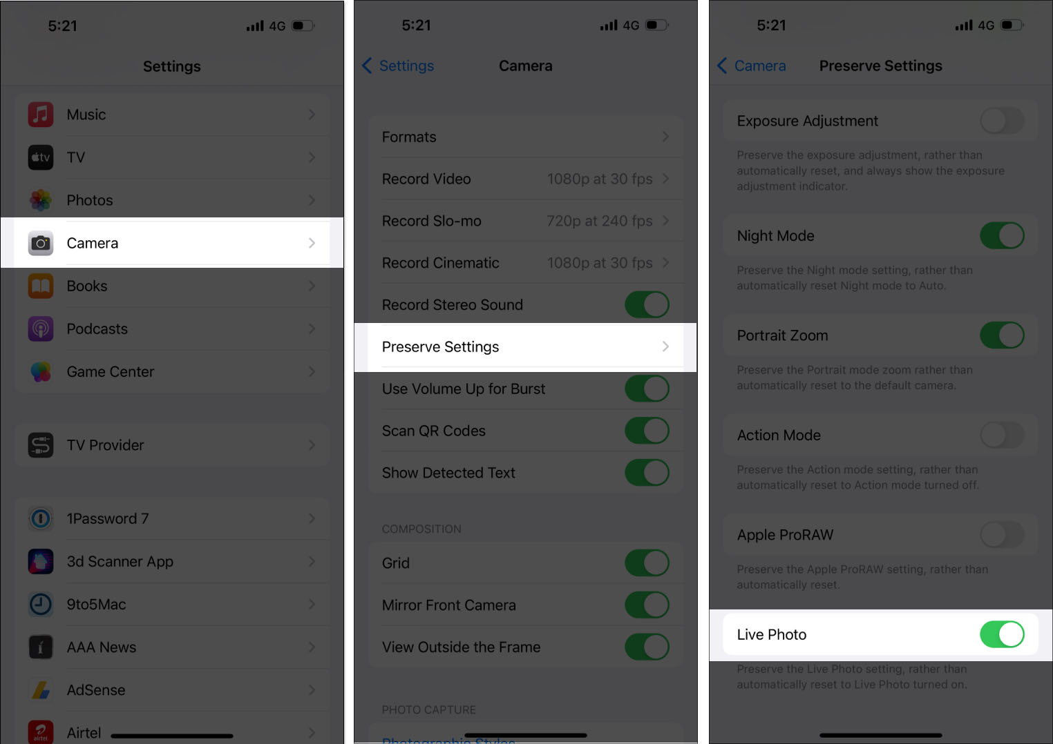 برای روشن کردن دائمی ویژگی Live Photo باید از روش زیر عمل نمایید: