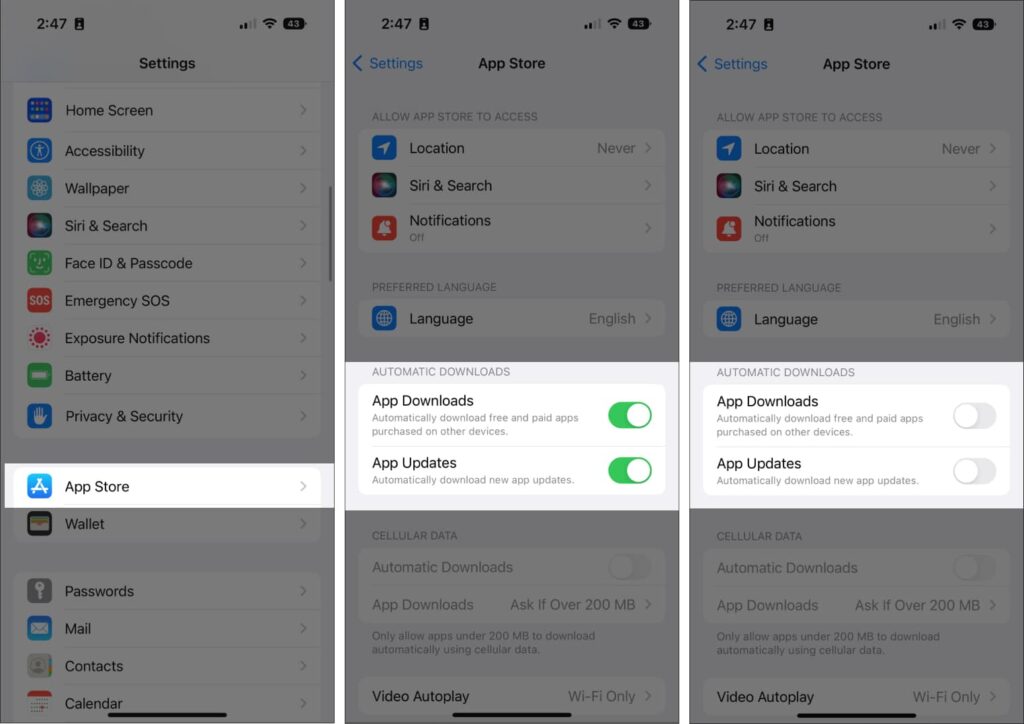 بروزرسانی و دانلود خودکار، میزان داده سلولار زیادی را مصرف می کند و سرعت اینترنت سلولار آیفون را کاهش می‌دهد. برای غیرفعال کردن این ویژگی، ابتدا در آیفون به Settings و سپس به App Store رفته و زبانه App Download و App Updates را خاموش کنید. در صورت تمایل می‌توانید به تنظیمات بازگشته و همین کار را برای Music، Books و Podcasts نیز انجام دهید.