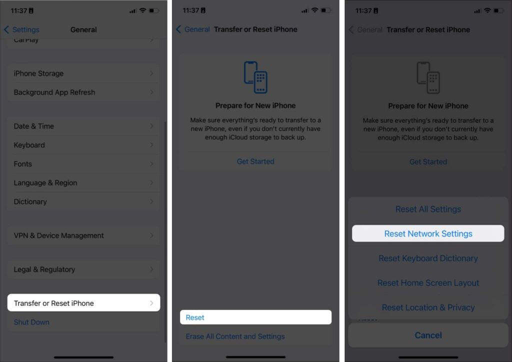 یکی دیگر از راه‌های افزایش سرعت اینترنت سلولار آیفون، پاک کردن تنظیمات شبکه است. نگران پاک شدن اطلاعات گوشی خود نباشید. این‌کار فقط هر چیزی که مربوط به تنظیمات شبکه داده است را ریست می‌کند. از جمله Wi-Fi، اتصالات VPN و تنظیمات بلوتوث. برای انجام این کار: