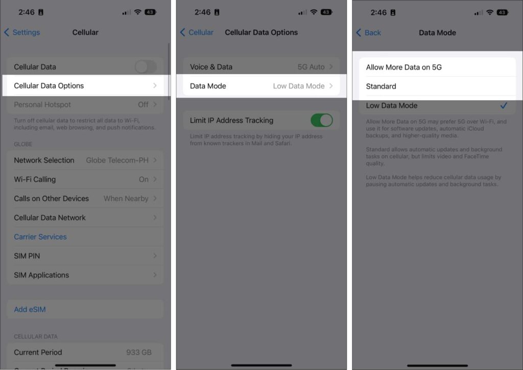 برای غیرفعال کردن Low Data Mode، ابتدا به Settings رفته Cellular و سپس بر روی Cellular Data Options ضربه بزنید، در قدم بعدی گزینه Data Mode و ِیکی از دو گزینه‌ی Standard یا Allow More Data on 5G را انتخاب کنید.