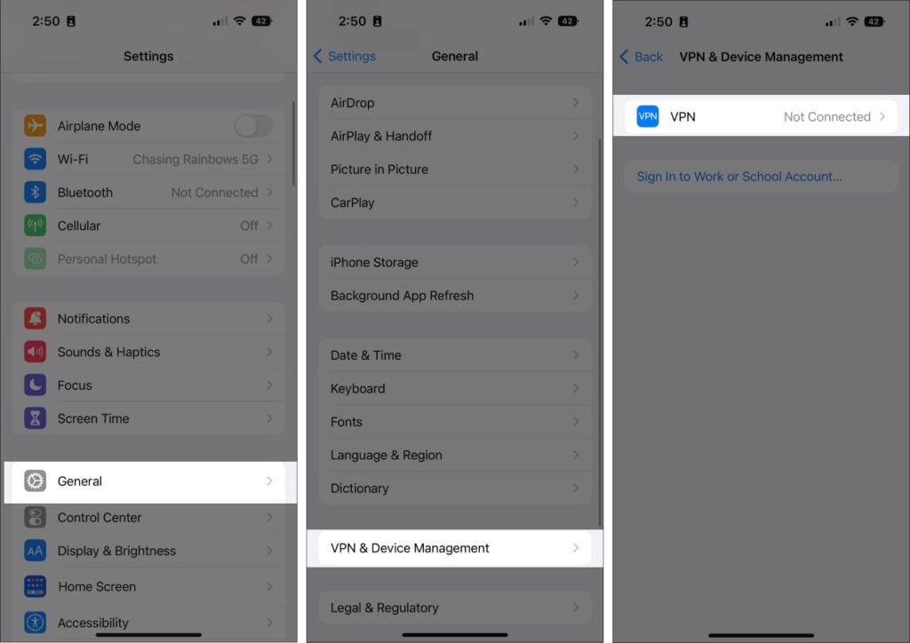 • به قسمت VPN & Device Management بروید و VPN را غیرفعال کنید.