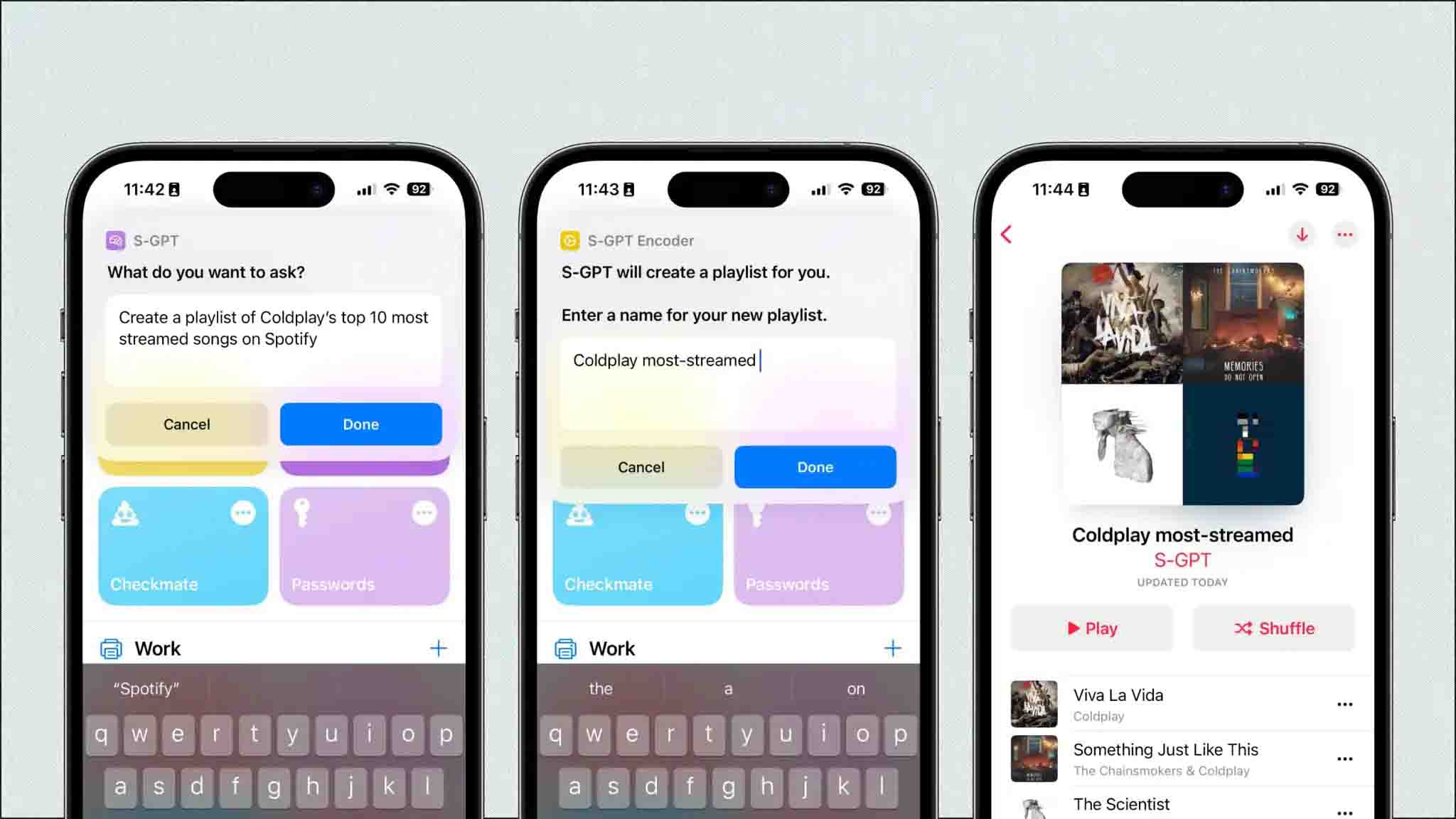 این یک ویژگی فوقالعاده است. شورتکات S-GPT میتواند تمامی آهنگهایی که چت جی پی تی بر اساس درخواست کاربران پیدا کرده را به صورت یک پلی لیست جذاب در برنامه Apple Music ایجاد کند. به طور مثال میتوانید از چت جی پی تی بخواهید: «یک پلی لیست با 10 آهنگ Emo از اواخر دهه 2000 تا کنون برای من بساز.» و یا بگویید: «من یک پلی لیست 15 تایی از بهترین آهنگهای boygenius میخواهم.»