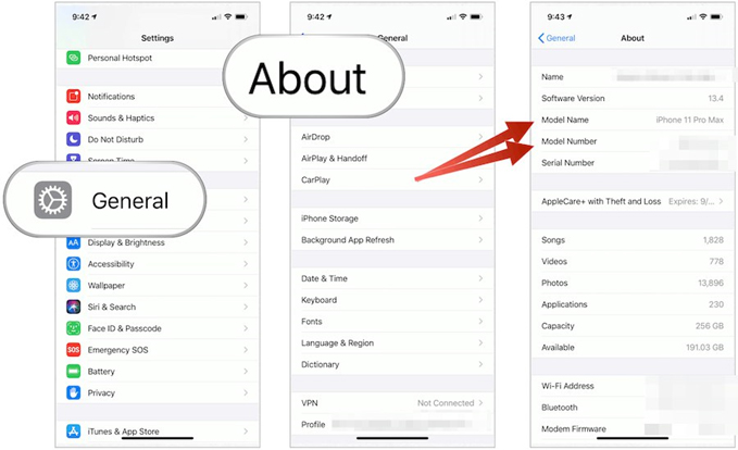 برای دانستن پارت نامبر محصولات آیفون کافی است که به پشت جعبه‌ی آن‌ها نگاه کنید. در کنار نام و مدل دستگاه، پارت نامبر آن‌ها نیز به‌صورت مخفف نوشته می‌شود. همچنین شما می‌توانید مدل و پارت نامبر آیفون خود را با مراجعه به مسیر settings>>General>>About بررسی کنید. موارد ذکرشده جزو پارت نامبرهای معروف آیفون در کشور ما هستند.
