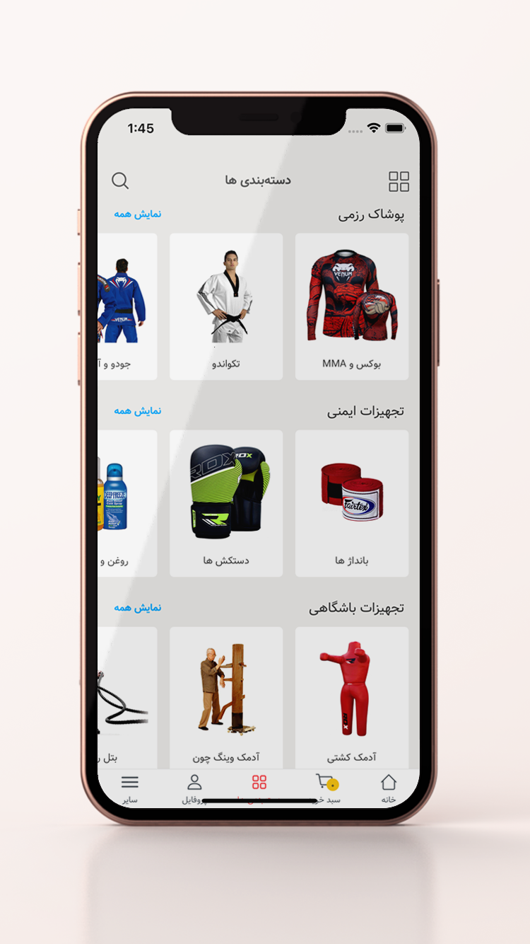 توی اپلیکیشن تک رزم میتونی هر وسیله ورزشی که زیر مجموعه این رشته ها باشه رو بخری: