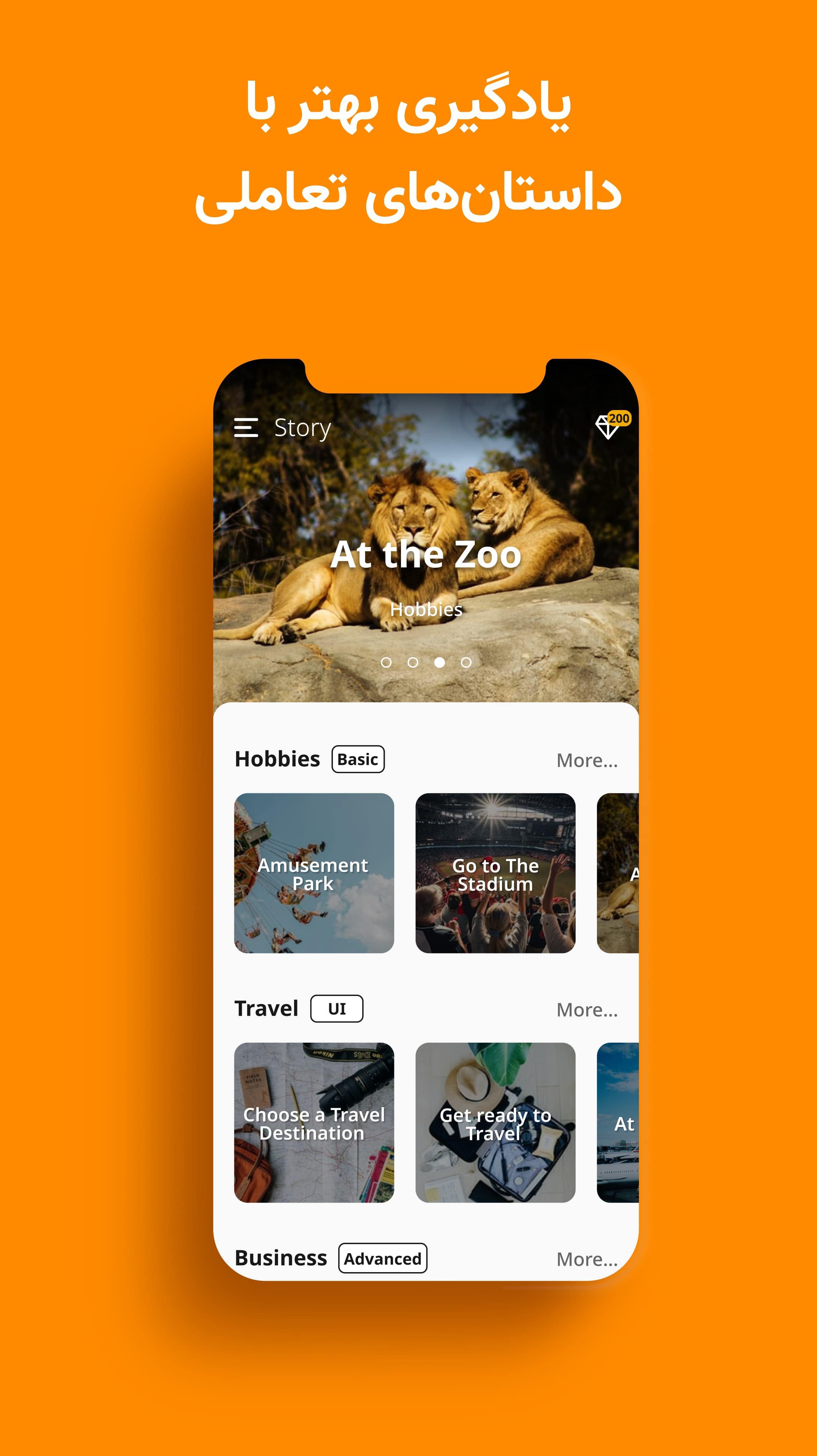 یکی از جذابترین قابلیتهای زبانیاد، بخش تعاملی Stories هست. به کمک Stories، تو موقعیتهای مختلف، تو یه کشور انگلیسی زبان قرار میگیریم و با تمام جملات کلیدی اون موقعیت آشنا میشیم. با انتخابهامون به شخصیتهای داستان کمک میکنیم که با بقیه ارتباط برقرار کنن و تو همین حین خودمون جملات پرکاربرد اون موقعیت رو یاد میگیریم. مثلا اگه کیفمون تو هواپیما جا موند، با چه جملاتی میتونیم منظورمون رو به مسئول پرواز بفهمونیم؟ با کمک این جملههای پرکاربرد، میتونیم با آمادگی ذهنی وارد هر موقعیت جدیدی تو یه کشور خارجی بشیم و خیالمون راحت باشه که ما قبلا تو زبانیاد این تجربه رو داشتیم.