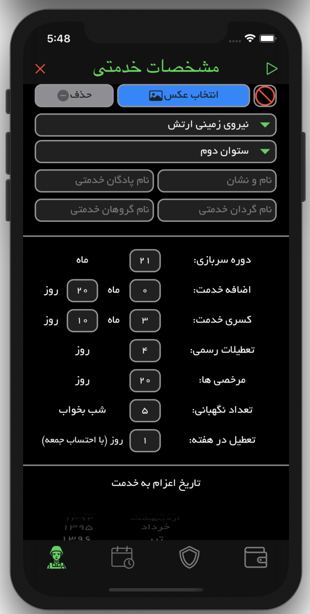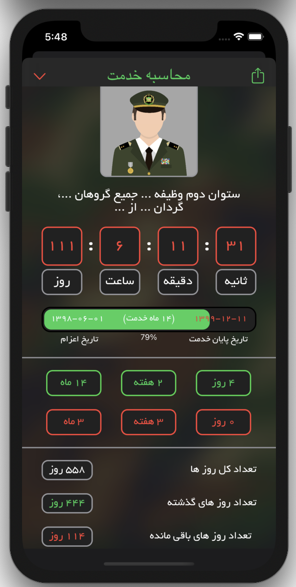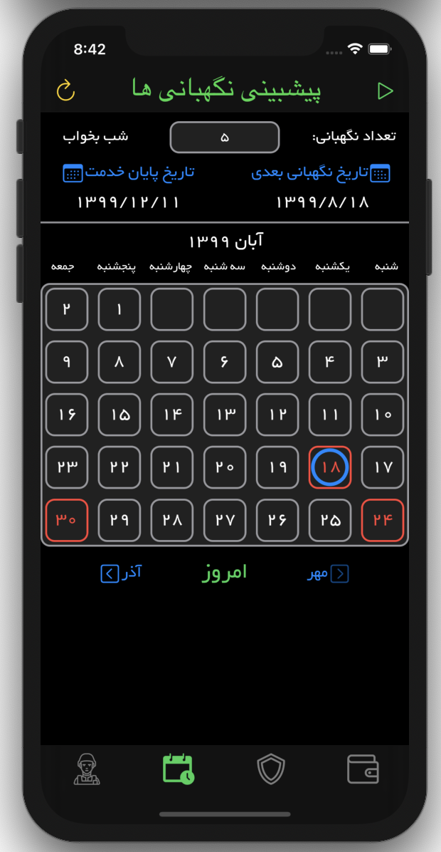 همچنین مقدار ماه هفته و روز گذشته و باقی مانده، تعداد روز های هفته، تعداد روز های تعطیل، تعداد روز های کاری و همچنین تعداد نگهبانی باقی مانده را نیز نشان میدهد.