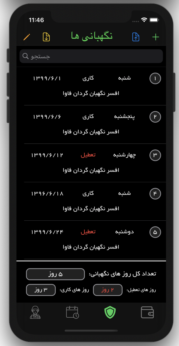 با استفاده از امکانات این برنامه میتوان همه نگهبانی های خود را ثبت کرده و آمار کل نگهبانی های داده شده همچنین روز های کاری و تعطیل را داشته باشید که در حقتان ظلم نشود.