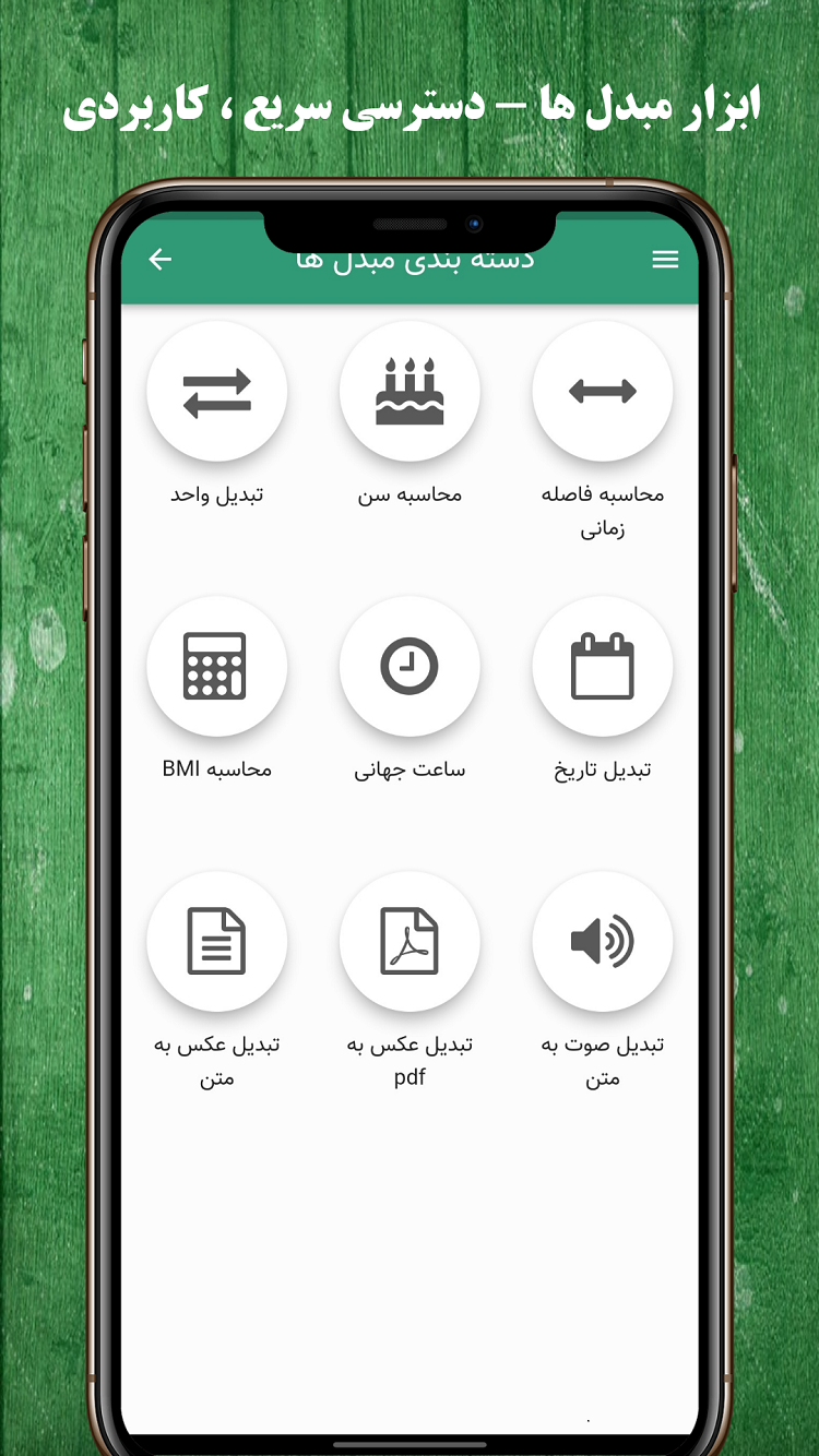 ابزار مبدل ها => محاسبه فاصله زمانی - محاسبه سن - تبدیل واحد - تبدیل تاریخ - محاسبه BMI - تبدیل صوت به متن - تبدیل عکس به pdf - تبدیل عکس به متن - ساعت جهانی