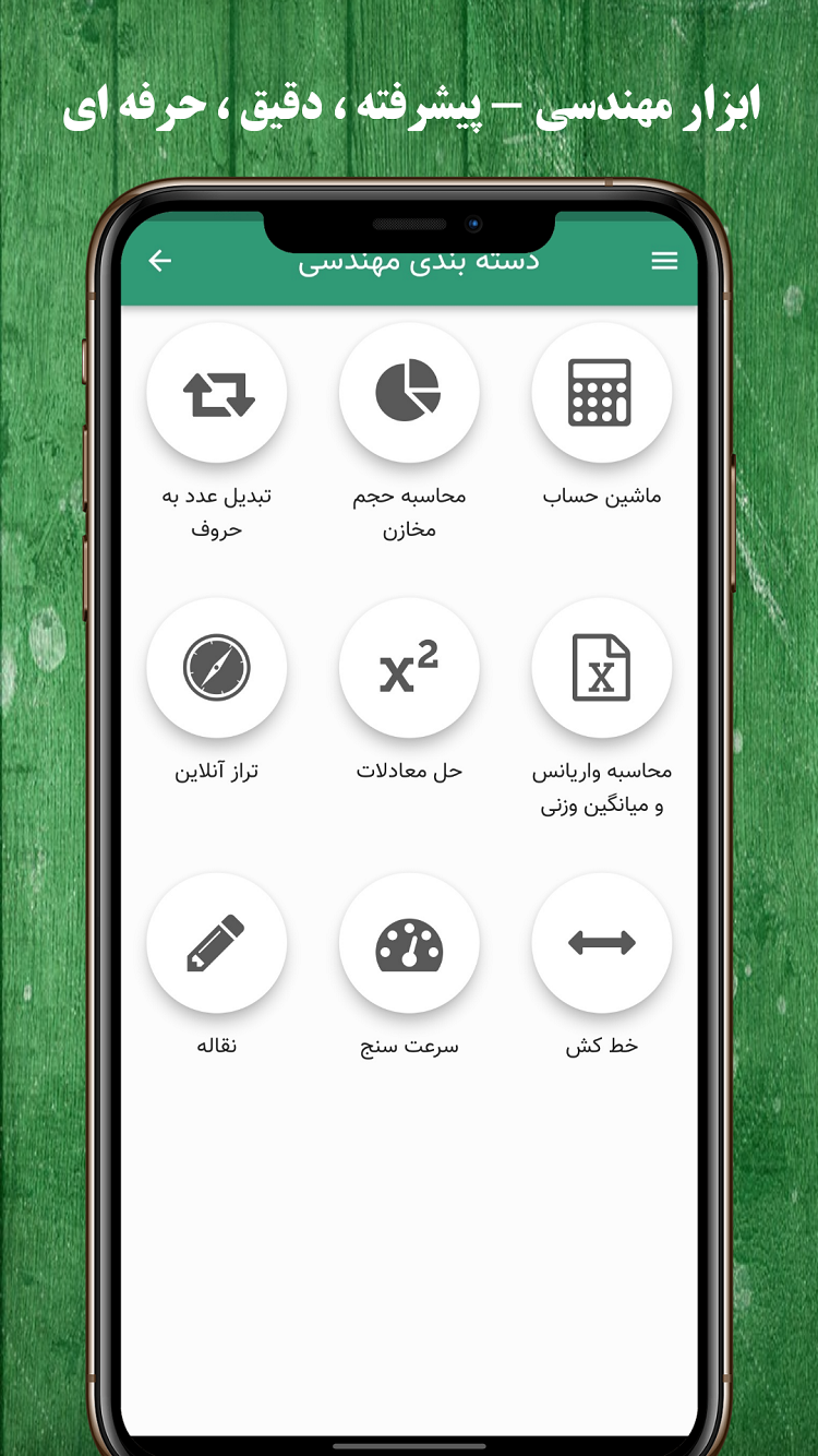 ابزار مهندسی => محاسبه حجم مخازن - تبدیل عدد به حروف - محاسبه واریانس و میانگین وزنی - حل معادلات - تراز آنلاین - خط کش - سرعت سنج - نقاله - ماشین حساب