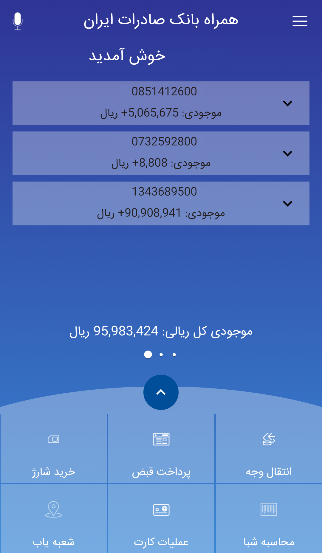 با نصب همراه بانک صادرات، پس از ورود در صفحه نخست تمام حسابهای بانکی شما به صورت یکجا نمایش داده میشود. موجودی قابل برداشت هر حساب با فونت درشت و خوانا درج شده تا در یک نگاه بتوانید وضعیت حساب خود را مشاهده کنید. سایر قابلیتهای همراه بانک صادرات آیفون در ادامه بیان شده است.